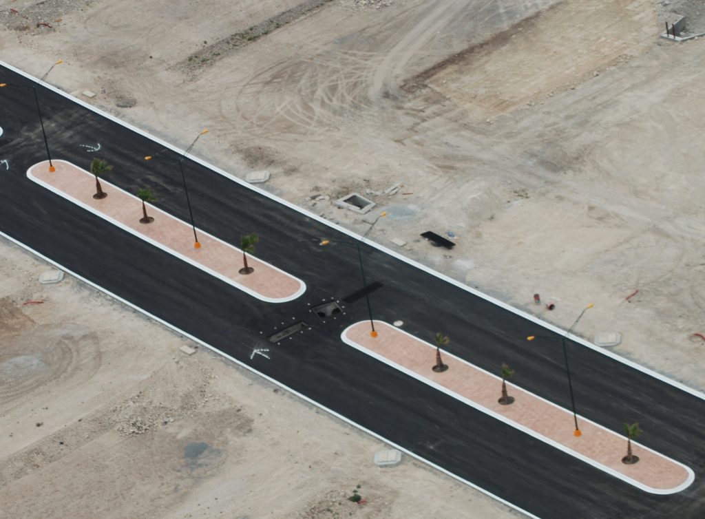 Desmontes, cortes, movimientos de tierra de 70,000 m3, terraplenes, formación de plataformas, red de drenaje sanitario, red de agua potable, red eléctrica subterránea, canal pluvial, terracerías, bases, carpeta asfáltica e infraestructura para 41 lotes industriales en un área de 9 hectáreas.